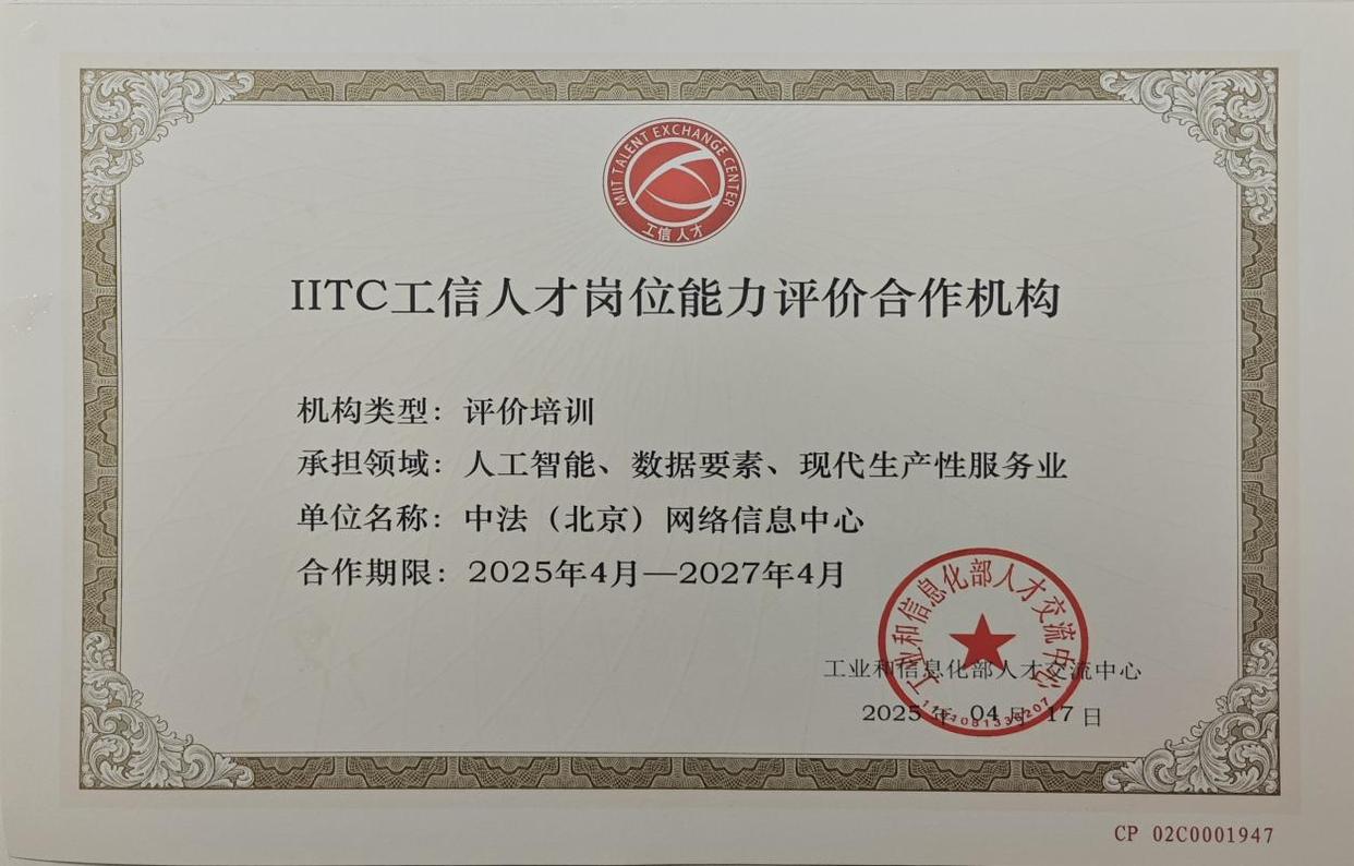 近日,工业和信息化部人才交流中心公布了《2025 年首批 IITC 工信人才岗位能力评价业务合作机构目录》,中法(北京)网络信息中心(以下简称:中法中心)依托在现代生产性服务业、人工智能、数据要素等领域的突出实力与专业积淀,成功入选,正式成为工信人才岗位能力评价业务合作机构,标志其在工信人才培养与评价体系建设领域获得国家级认可,将为行业发展注入新活力。