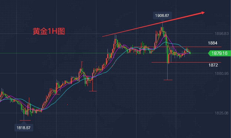 现货黄金周一上演了多空双杀的局面,周一上午,金价一路上行,一度突破1900美元关口,随后便开始下跌,从1906.67美元的日高跌至1854.90,最大跌幅达51美元,随后回升至1876美元附近。最终收跌0.23%,报1876.44美元/盎司。