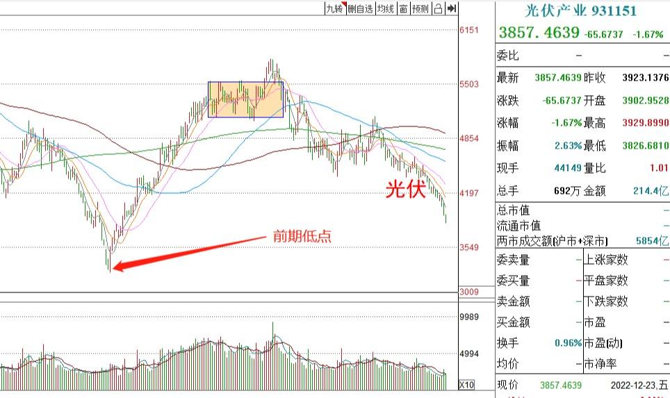 光伏板块最近利空消息频发,隆基和TCL开始打硅片的价格战,下调20%左右,降价速度非常快,在现在这种利好未必上涨,利空一定下跌的行情当中,这种负面情绪预计会继续延续,单纯从技术角度来看,现在光伏很有可能会跌到前期低点附近,去寻求支撑,距离大概有16%左右,所以如果仓位偏重,需要考虑降低布局的速度,以免出现光伏没有调整到位,子弹却提前打光的现象。