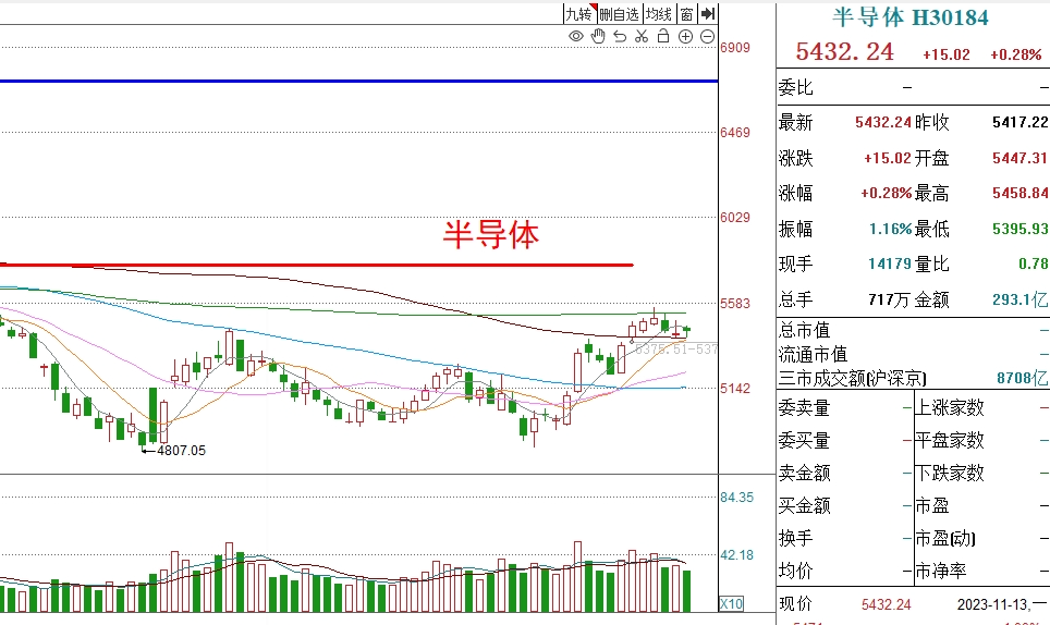 半导体今天缩量调整,全天振幅不大,少然继续维持之前的判断,近期不排除会向下调整,少然会在下方20日均线,或前期低点附近考虑入场参与短线。