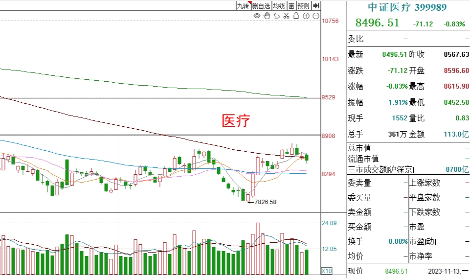 医疗板块今天放量下跌,形成了三连跌的走势,不过少然认为风险不大,大概率是因为前期涨幅过快,近期需要调整而已,少然认为医疗板块近期有主力在分批加仓的迹象,所以少然会跟随主力的思路一同入场加仓。