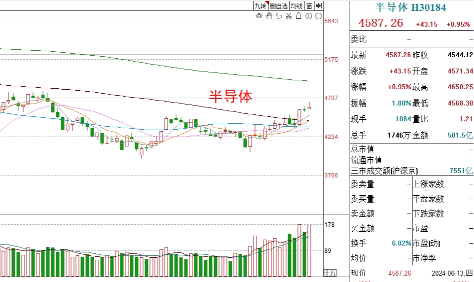 半导体今天冲高回落,冲高是因为主力正在布局这个方向,回落是因为现在双脚离地,没有均线作为支撑,需要调整一下,所以少然认为半导体近期可能会向下去回踩5日均线,或者维持横盘,等待5日均线上涨、提供支撑。少然会等确认支撑之后,将剩余的短线仓位加进去。