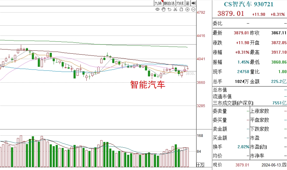 智能汽车今天继续小幅上涨,现在来到了120日均线附近,根据最近三个月的走势来看,这条线存在着较强的压力。少然会等突破之后恢复短线的操作策略,现在以长线布局为主。