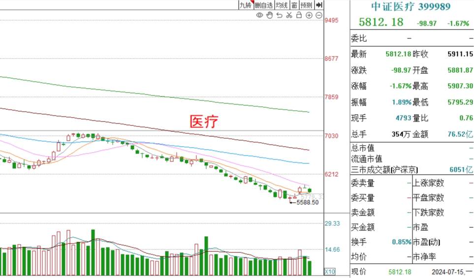 医疗还是我们熟悉的那个医疗,上周快速拉升并没有改变今天下跌的事实,目前医疗还在下降趋势当中,少然会继续保持观望。