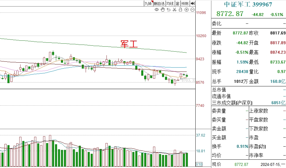 军工这两天迟迟没有向上突破压力位,有可能要往下去调整一下,不过现在距离前期低点很近,下调的空间有限。
