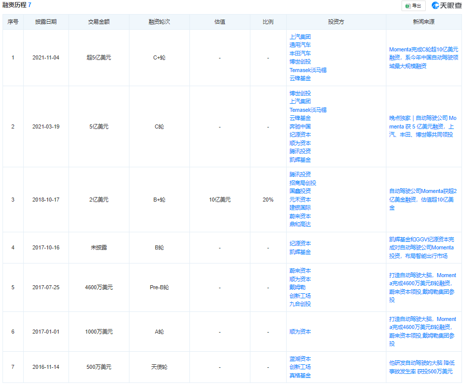 从融资表现来看,该公司长期受到资本关注。据天眼查,Momenta已完成7轮融资,最近一轮发生在2021年11月,交易金额超5亿美元,C轮累计融资额超10亿美元,投资方包括上汽集团、通用汽车、丰田汽车、博世创投、淡马锡、云锋基金等。