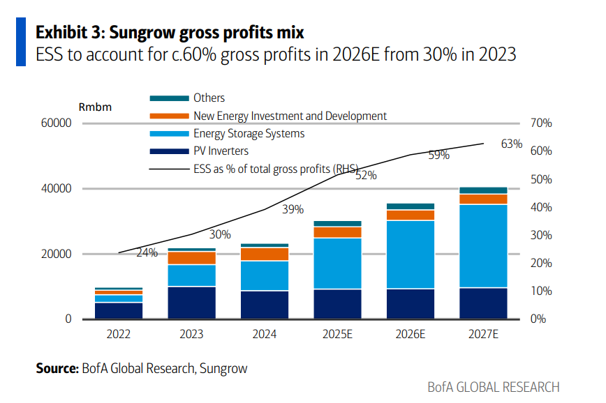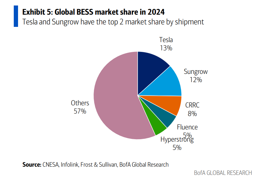 【2024年全球储能电池市场份额,阳光电源仅次于特斯拉。图源:美银】