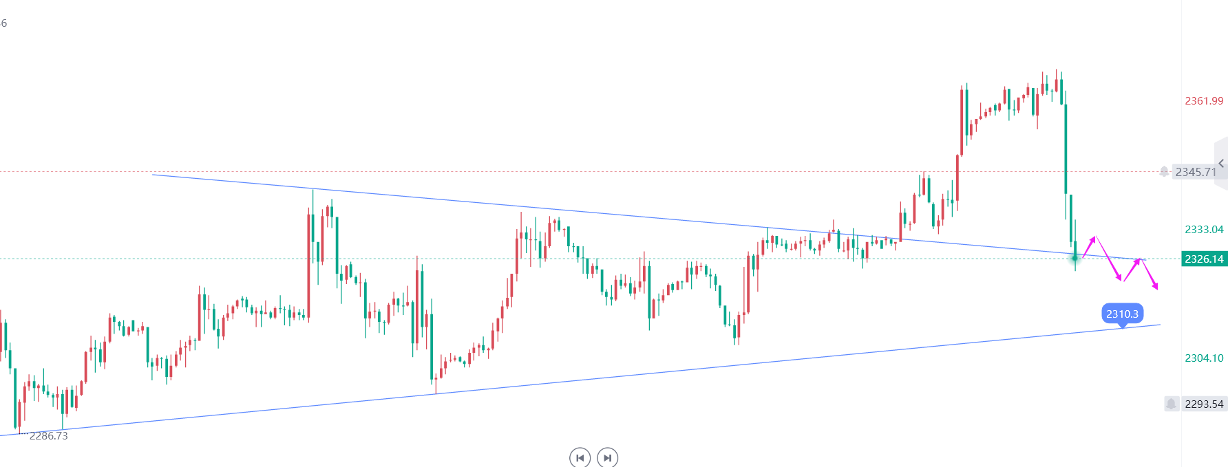 黄金走势分析:回顾一下上午的分析与思路:原本计划是等待回调去做多,看涨2365破位到2378布空,且是中长线空单看下跌的。但是走势是回撤力度较小,所以实盘是在57上车多单到68止盈,美盘开盘后一路下跌,我们预计的大跌也如期到来。