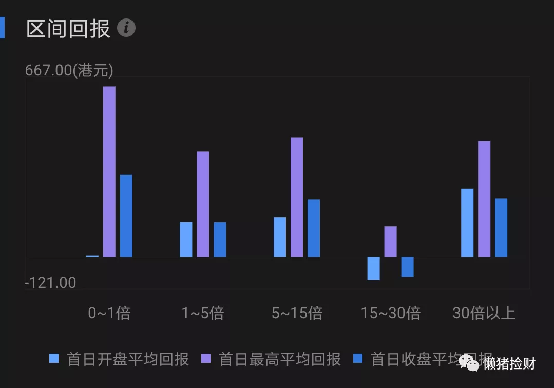 再看下面一幅图是最近一年的新股首日回报金额,大部分都是正数。(图中倍数可简单理解为新股认购的火热程度)