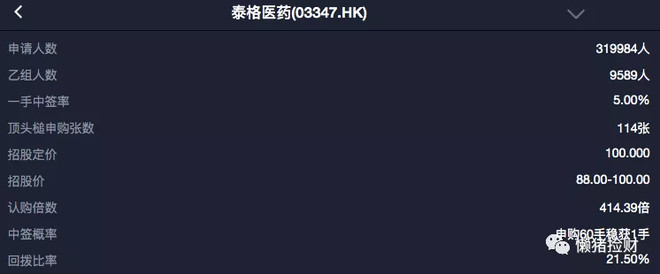 这次泰格医药认购人数接近32万,超额认购倍数414倍,回拨21.5%,一手中签率5%,申购60手稳重1手。最终以100港币上限定价。乙头分配7手,国配超20倍。