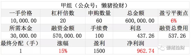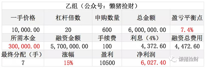 甲组60手稳中1手,杠杆按20倍计算,利息按4%,计息7天,最终净利润1000左右,大家可根据券商实际情况调整,利息偏差不大,融资倍数更影响的是所需本金。