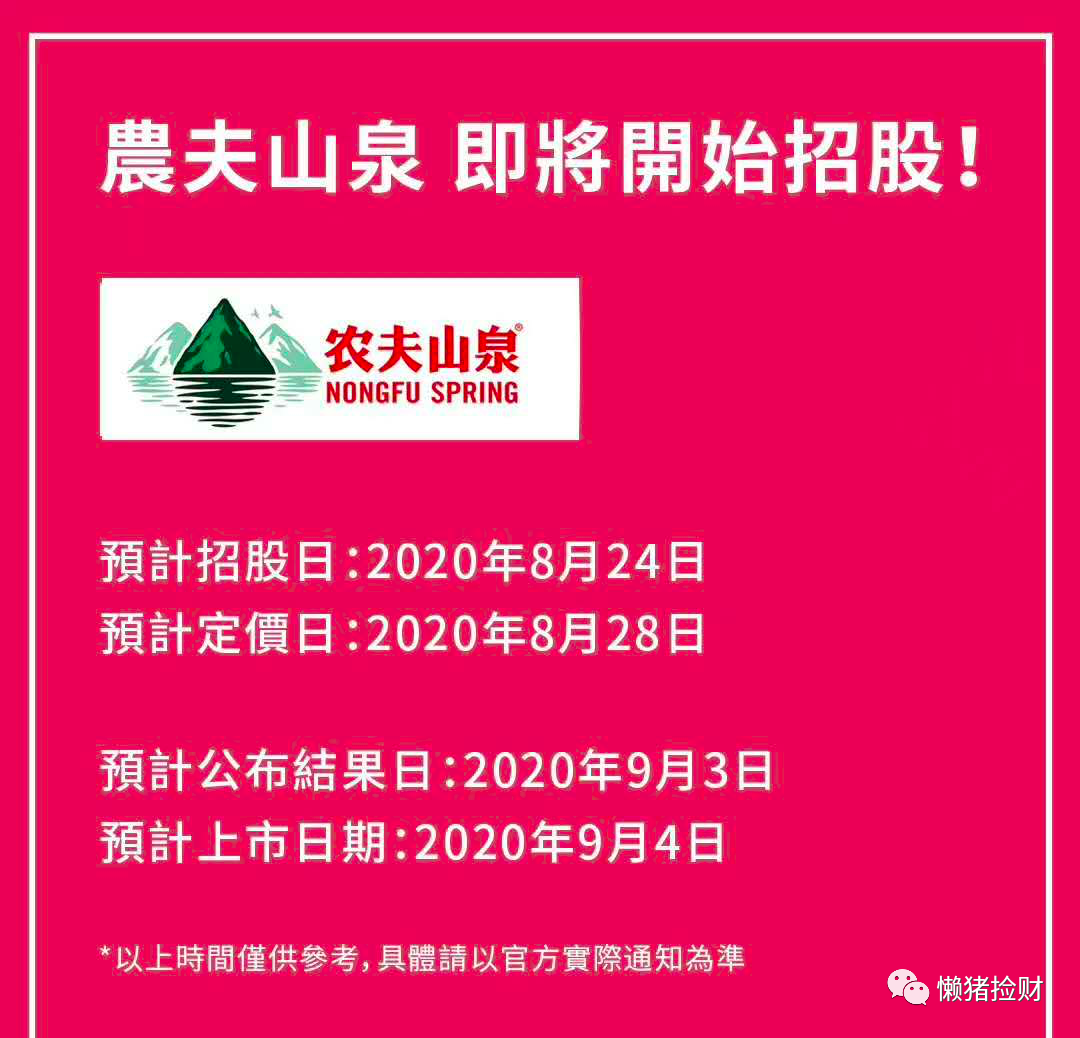 农夫山泉近期传出招股时间,预计是8.24-8.28,9.3公布中签结果,9.4上市,具体以官方宣布为准: