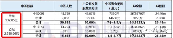 乙组最低档真的是980万,这样很多准备融资五六百万的,将会变成甲尾,通常热门新股乙组的认购倍数是要远超甲组的,即使这样甲组的中签率也不高,加上如果很多预备的乙头掉到甲组,那甲组的惨烈情况可想而知,一手中签率5%,200手稳中1手都保守了