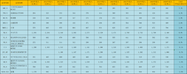 我们统计了横跨汽车、日化、美妆、食品、饮料和烟草行业14家公司(以市值排序为:雀巢、宝洁、丰田、欧莱雅、可口可乐、菲利普莫里斯、联合利华、百威英博、通用汽车、卡夫亨氏、菲亚特克莱斯勒、泰森食品)过去10年的营收,发现它们已集体陷入停滞:十年CAGR(年复合增长率)最高的也就7.4%,中位数为0.6%。