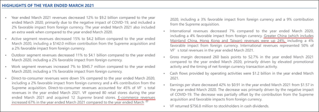 无论如何,Vans和Dickies母公司威富公司的财务表现足以说明一切,截止2021年3月的财年:收入为92.4亿美元,亮点在于,其电子商务收入同比增长了67%,大中华区收入增长24%。