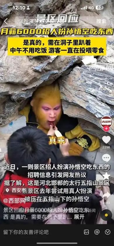 邯郸太行五指山景区,月薪6000招募孙悟空在五指山下趴着,负责吃游客投喂,“不用吃中午饭”。