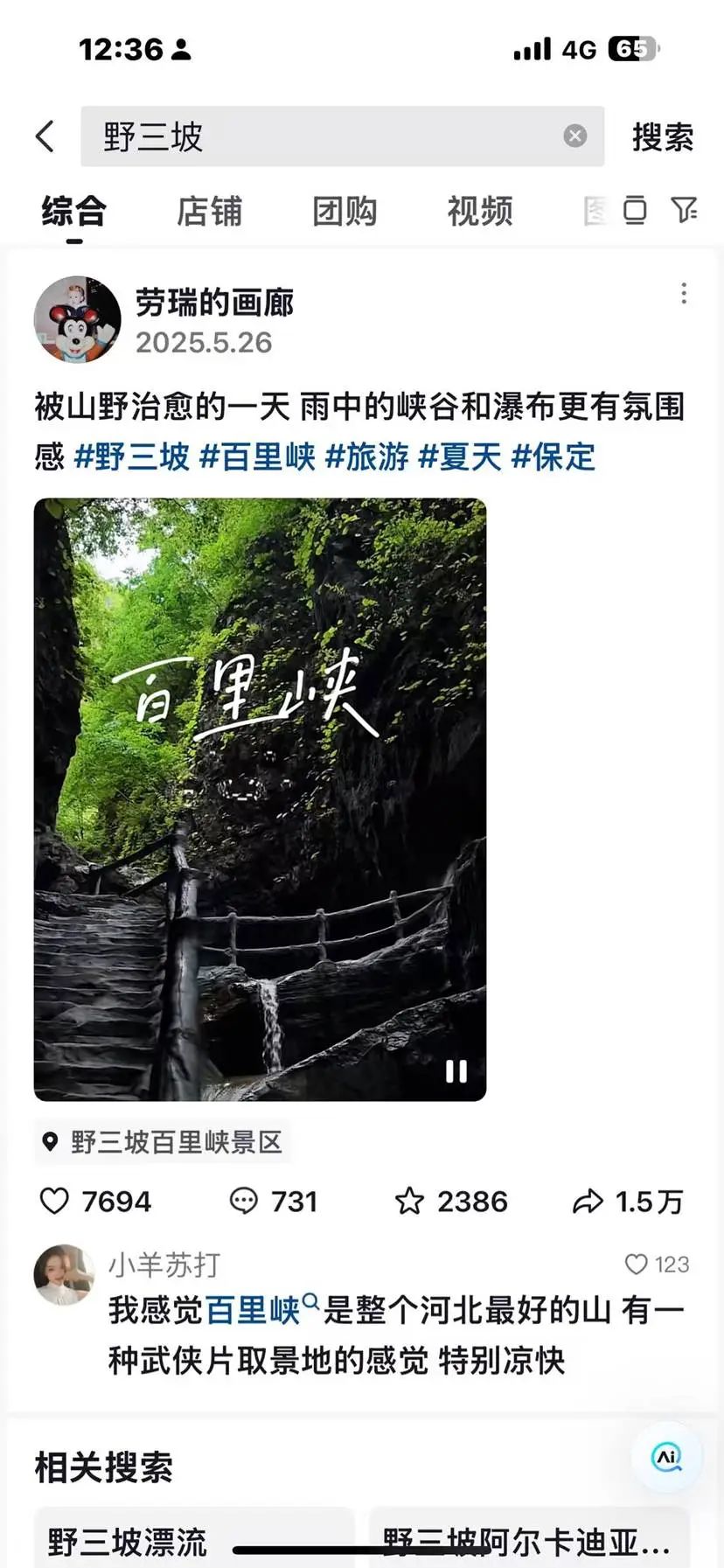 在抖音的团购中,野三坡套票从165打折到110元,而新人券下单直减5元,这也让野三破直冲当地热门打卡榜第一名。