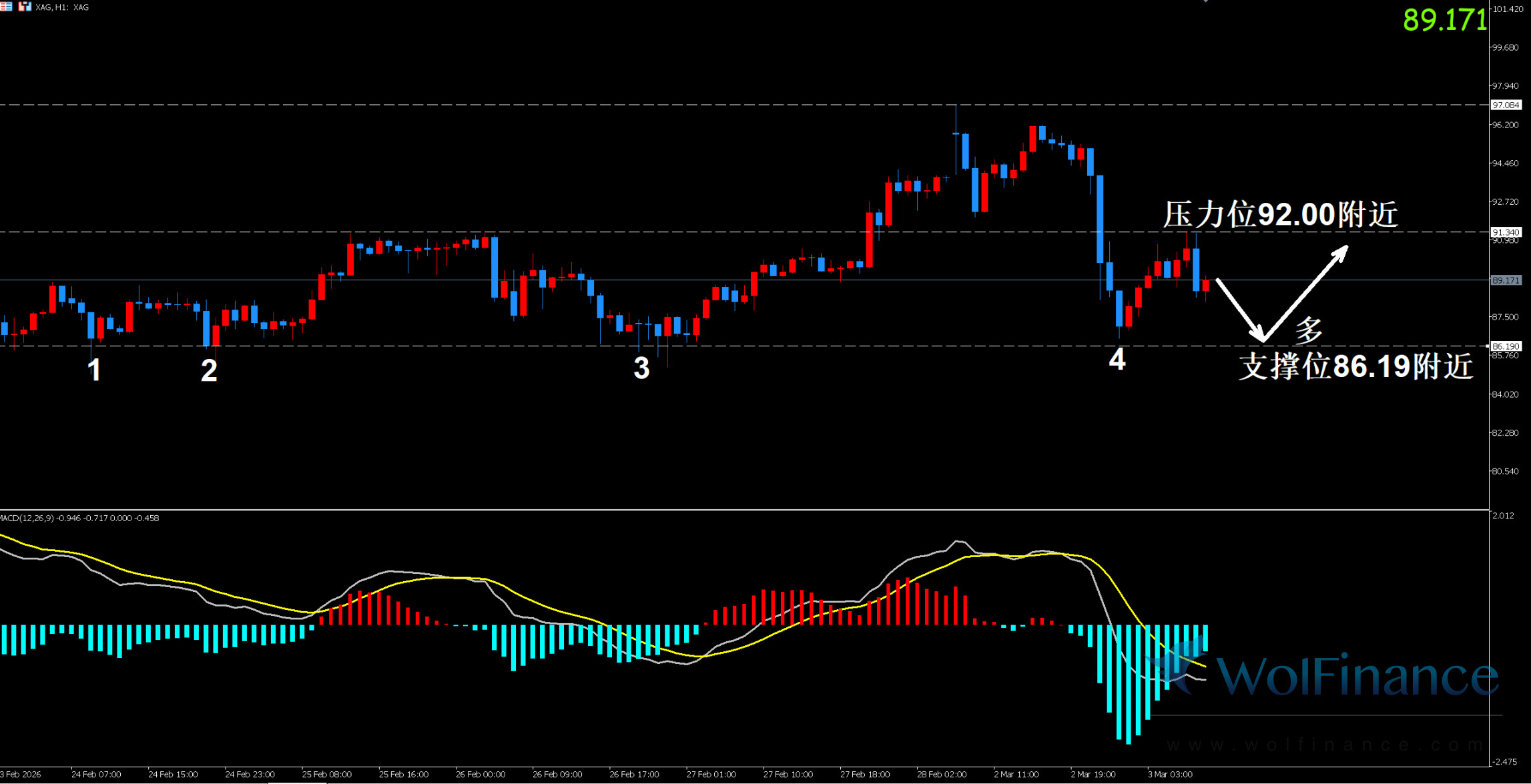 1. 白银技术图表显示目前K线支撑位86.19附近