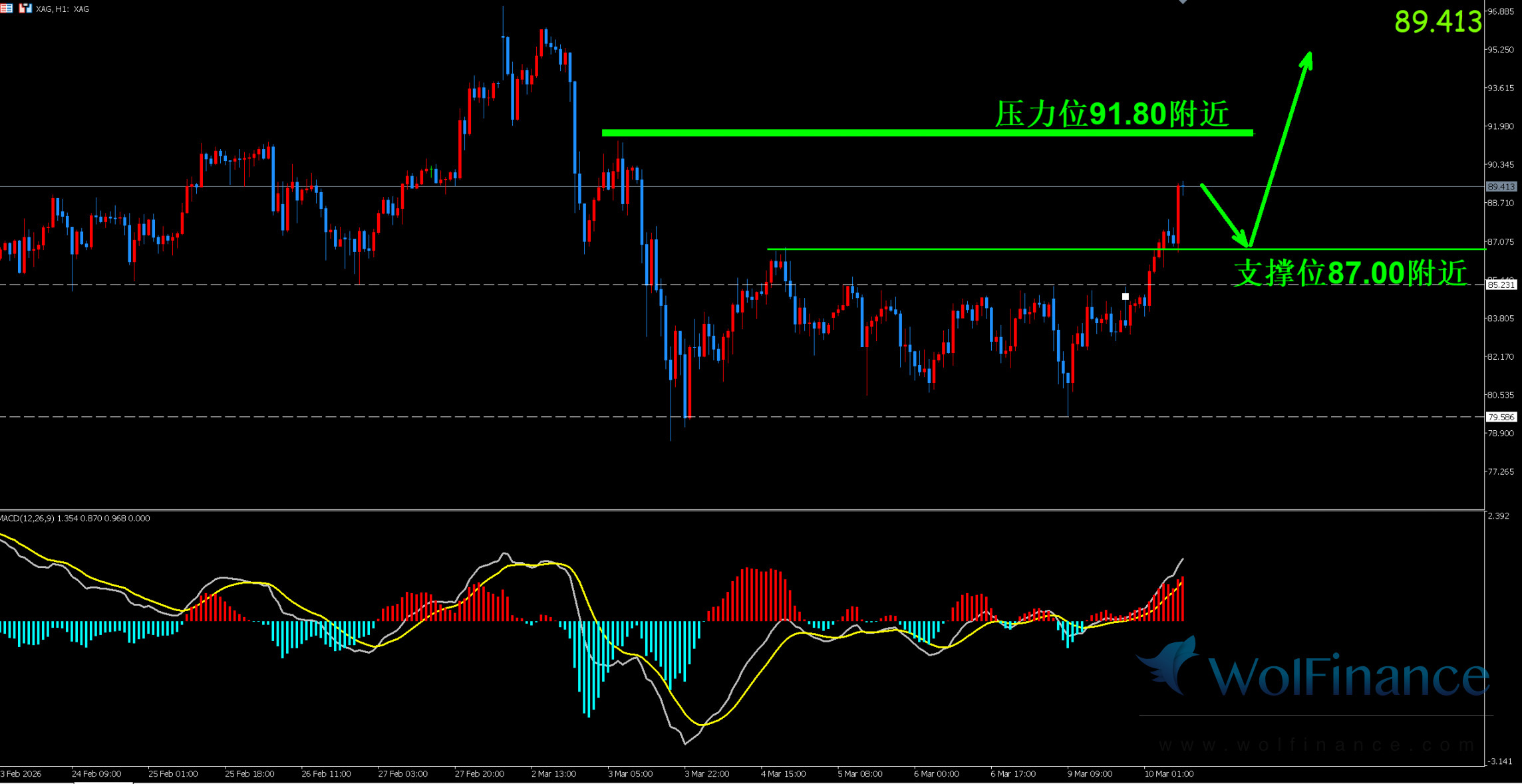1. 白银技术图表显示目前K线支撑位87.00附近