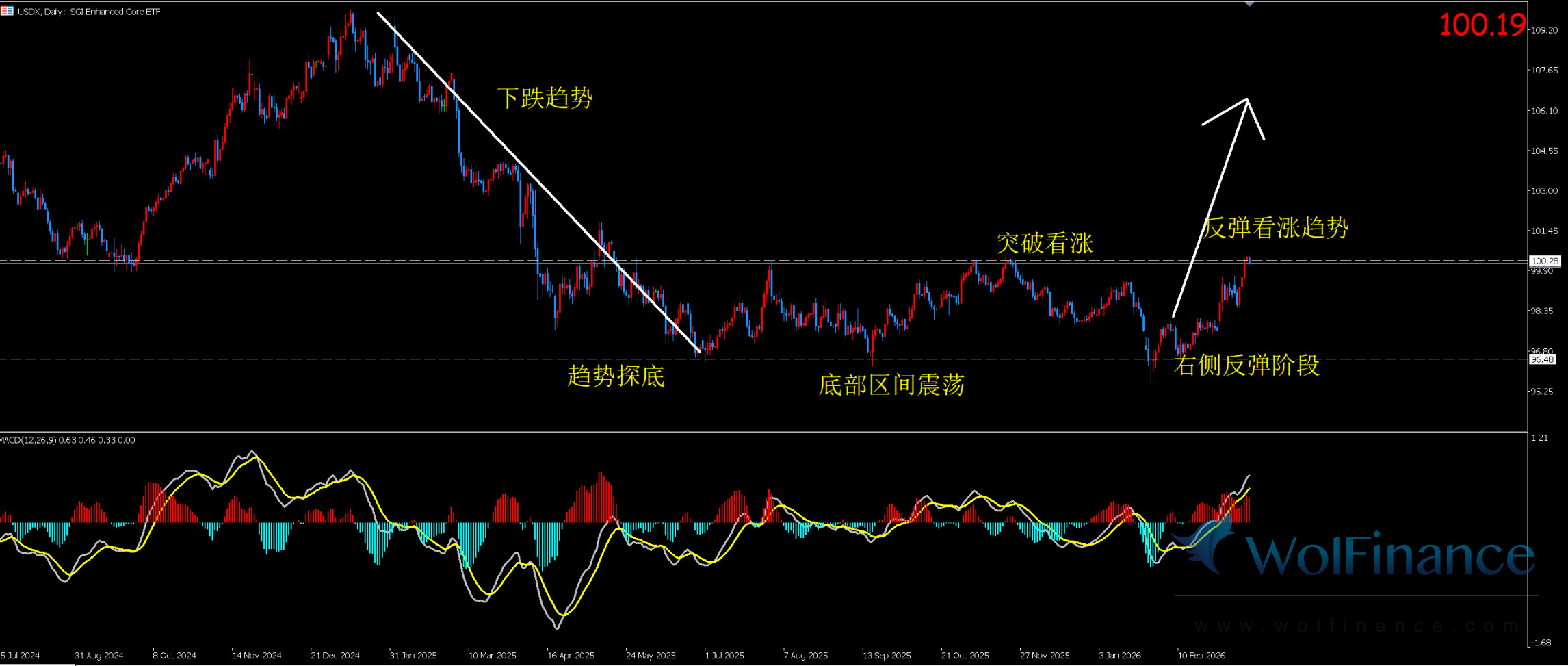 图表显示目前美指为高位震荡偏强走势,维持强势格局,对黄金形成持续的计价压制与资金分流压力,限制金价反弹空间。