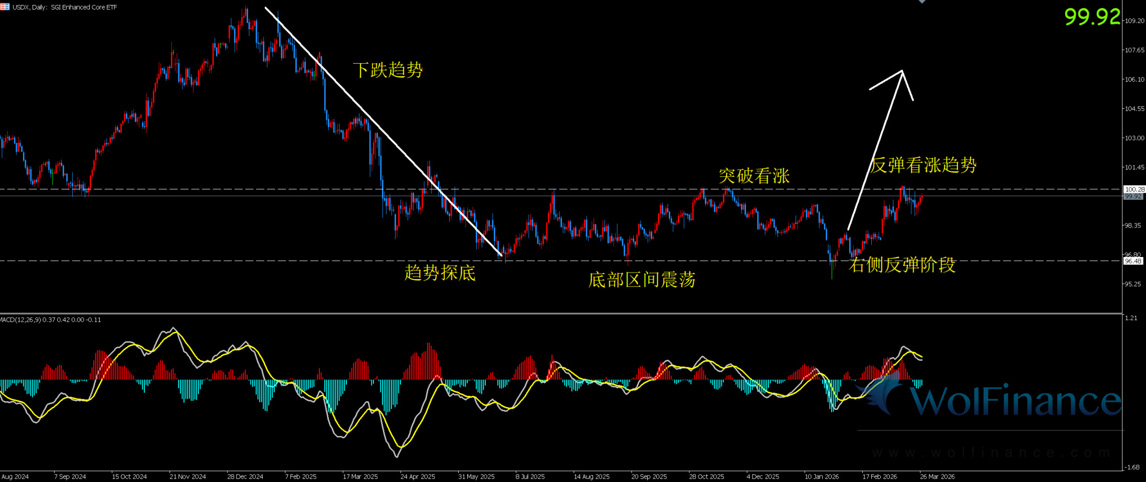 图表显示目前美指为高位震荡偏强走势,维持强势格局,对黄金形成持续计价压制与资金分流压力,限制金价反弹空间。