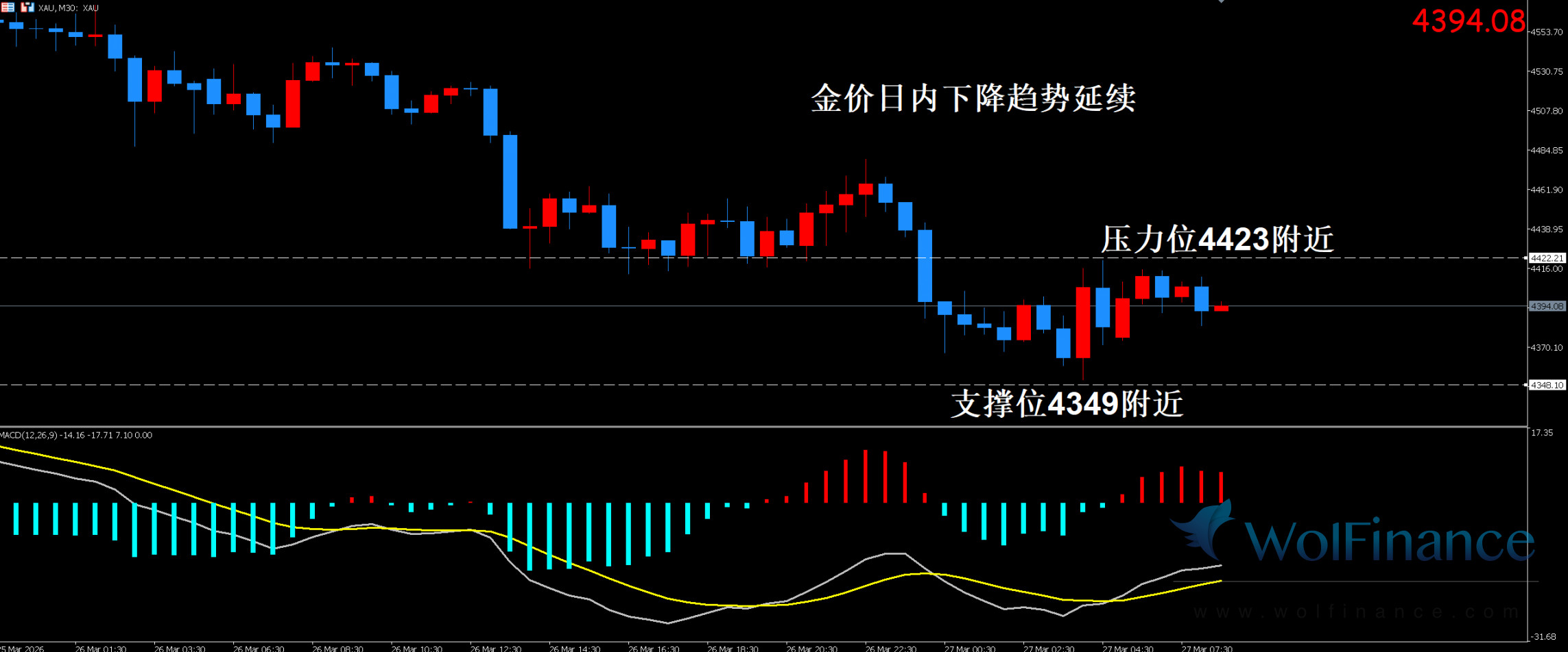 周五(03 月 27 日)黄金早盘下降趋势延续,当前价格报 4394.08 附近,核心源于美联储 3 月鹰派利率决议持续发酵,高利率常态化预期主导市场,无息黄金持有成本大幅抬升,资金持续撤离贵金属市场转向美元和美债生息资产。