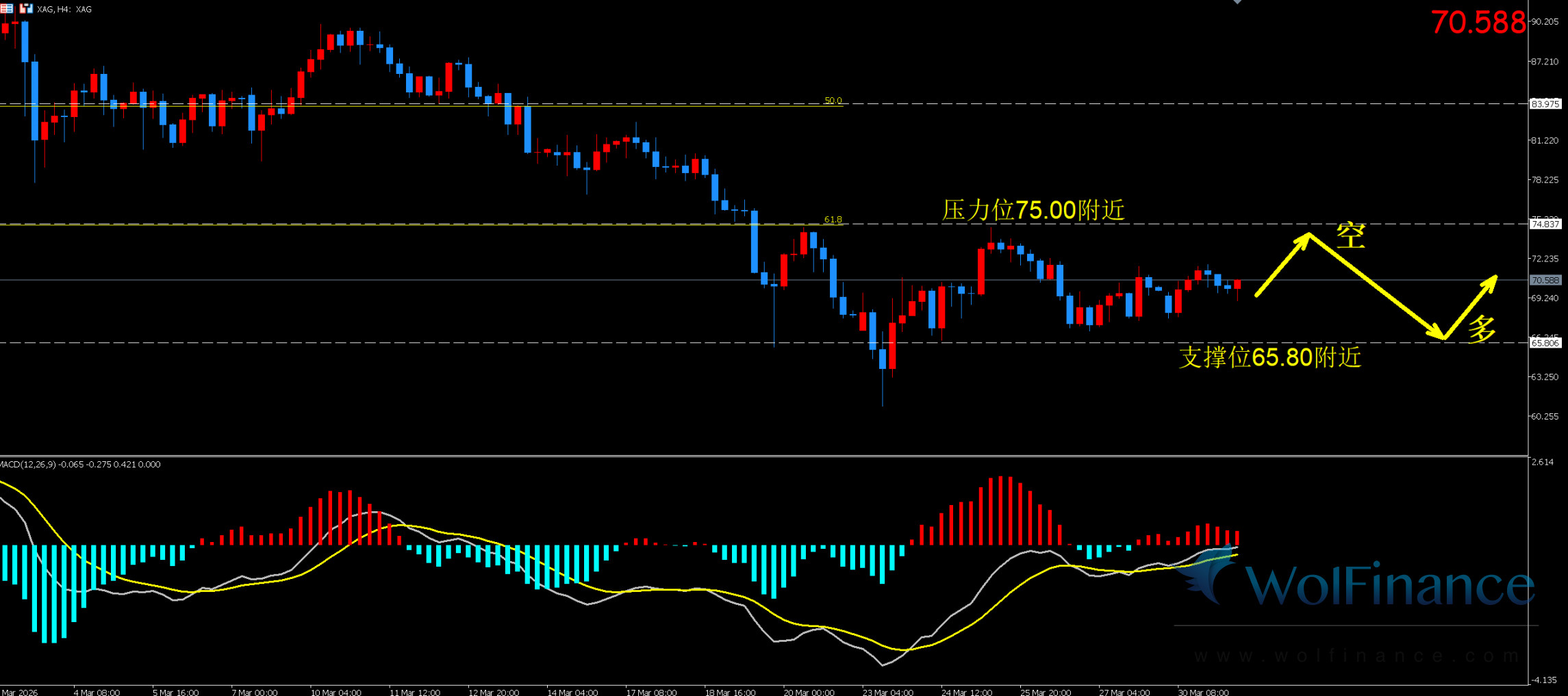此外,工业需求层面:中国 3 月制造业 PMI 录得 50.8,重返荣枯线以上,春季开工旺季临近,光伏、新能源汽车领域用银需求预期回暖,为银价提供托底;但全球制造业 PMI 仍偏弱,工业消费端支撑力度尚未完全释放。短期来看,美元强势仍是主导压制力量,地缘风险与中国需求回暖提供阶段性支撑,银价维持区间震荡格局,操作上先看支撑位企稳低多,反弹至压力位后顺势布局空单。