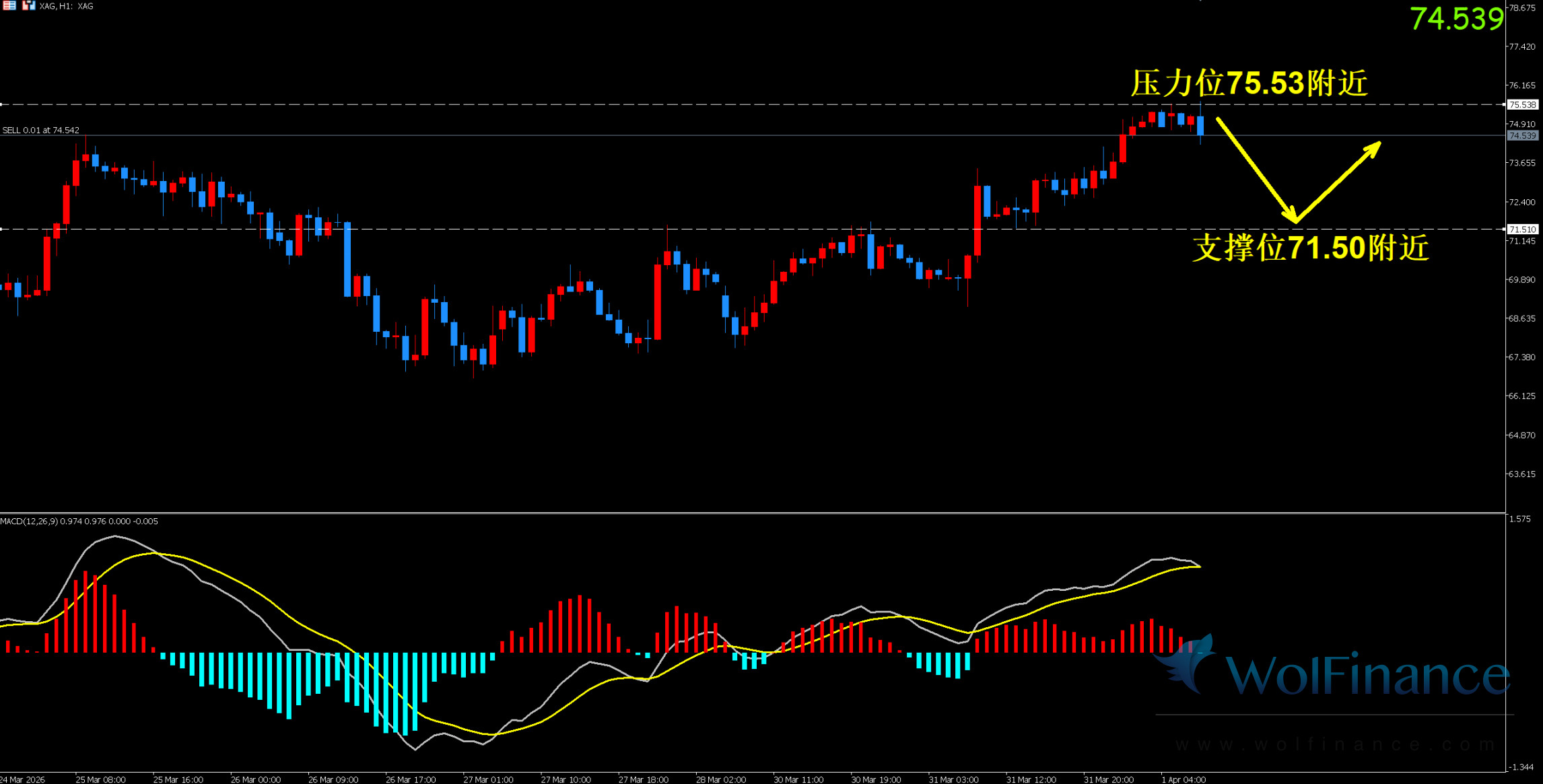 压力位:75.53 附近(近期反弹高点 + 日线关键阻力带)