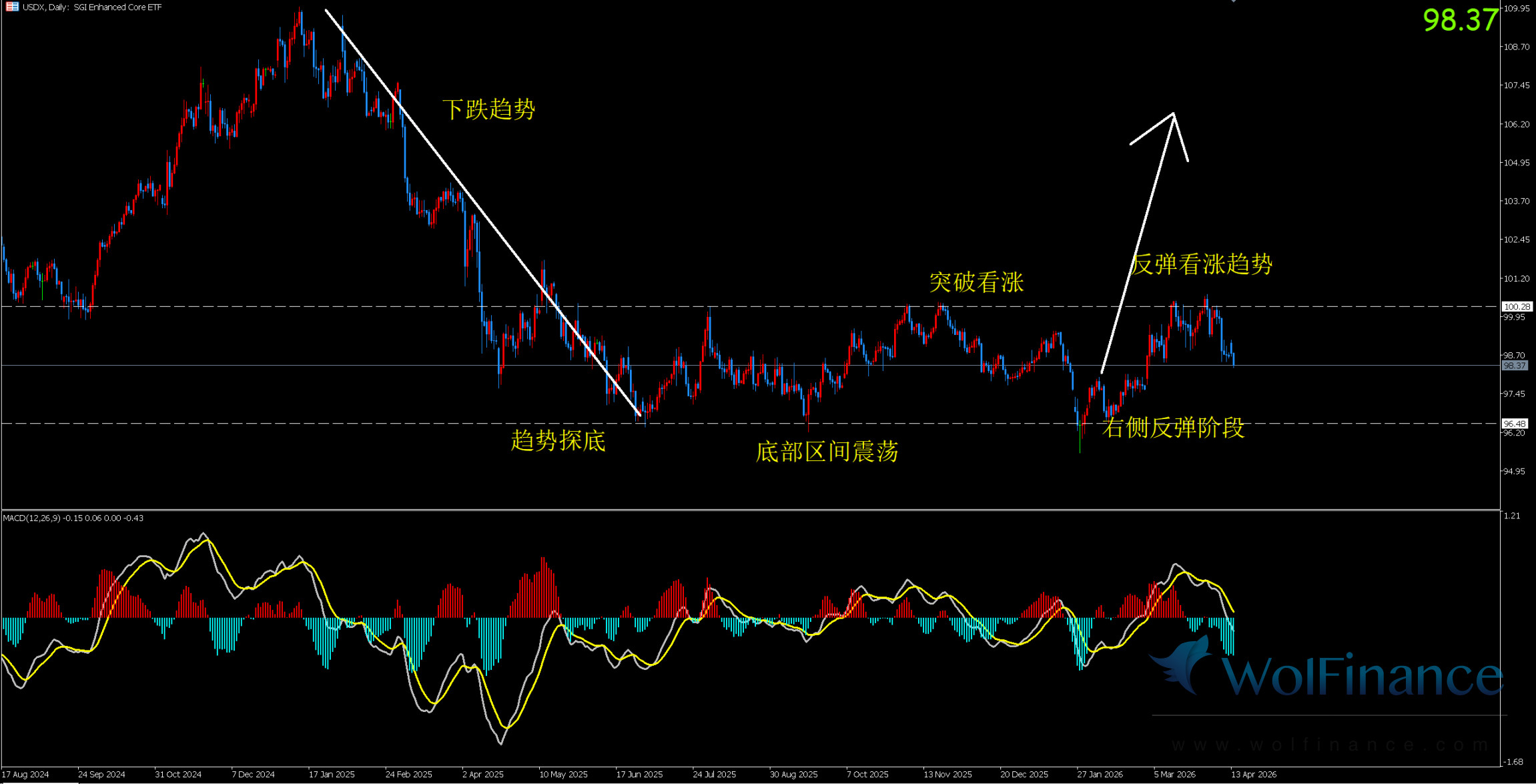 图表显示美元指数处于右侧反弹阶段后的持续回落,当前维持弱势震荡格局,受美国通胀数据回落与美联储政策预期影响,美指对以美元计价的白银的计价压制持续减弱,为银价持续上行提供了有利条件。