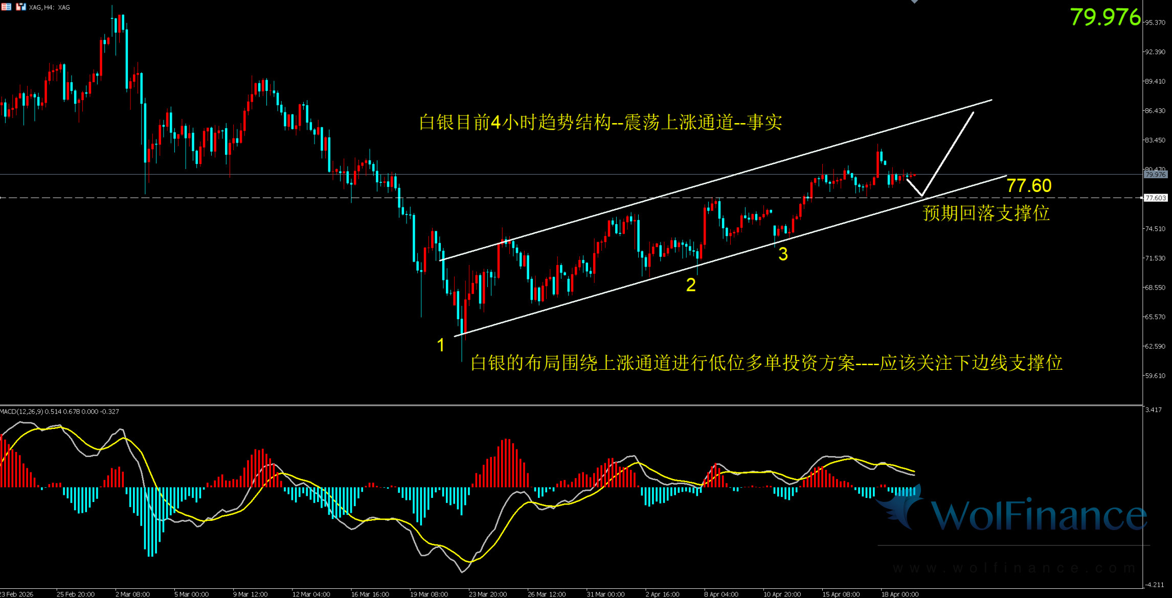 支撑位:77.60 附近(上涨通道下沿 + 预期回落支撑位)