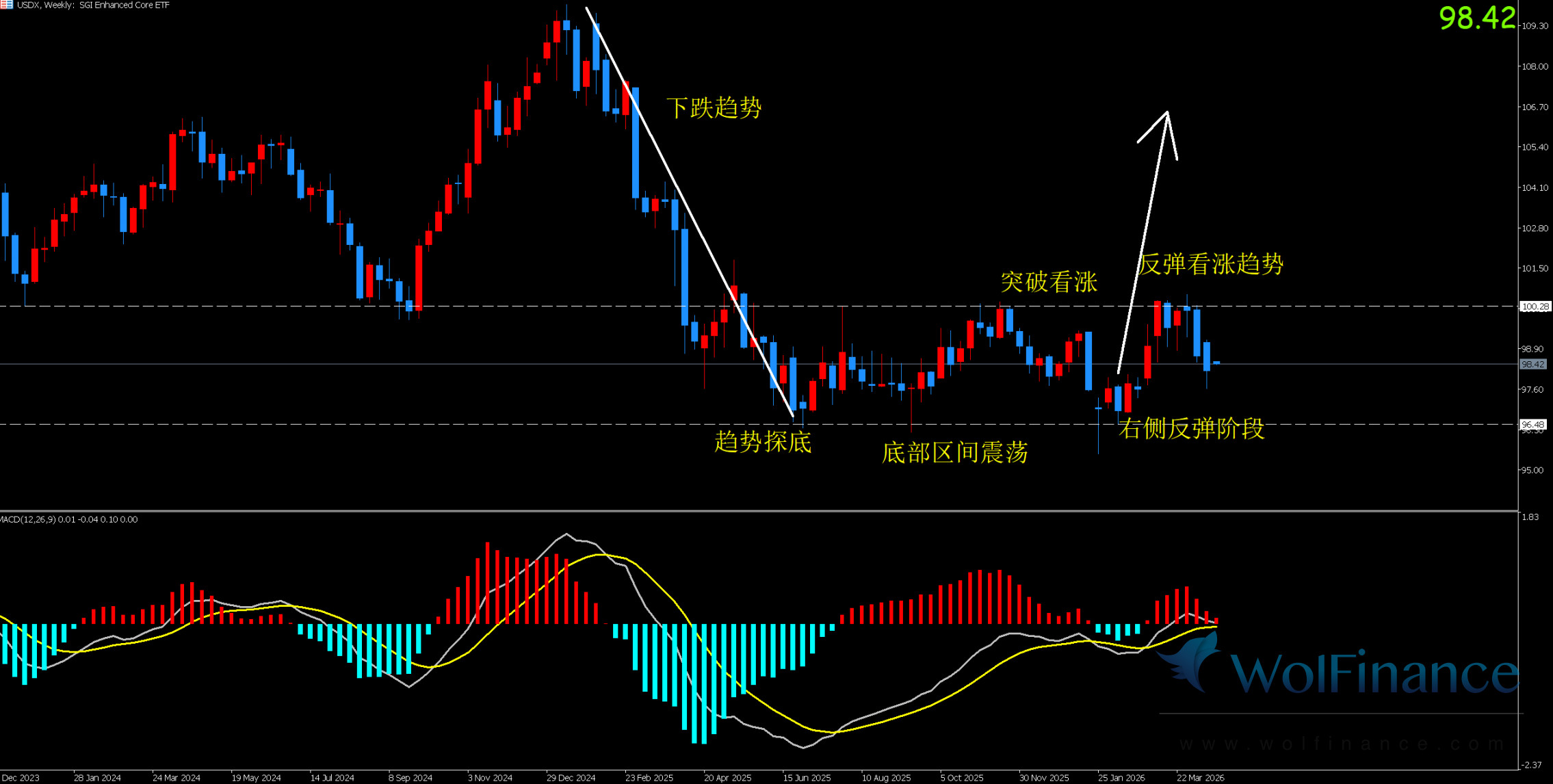 美元指数处于周线级别右侧反弹阶段,当前维持高位震荡格局,对白银的计价压制持续存在,限制了银价的反弹空间。