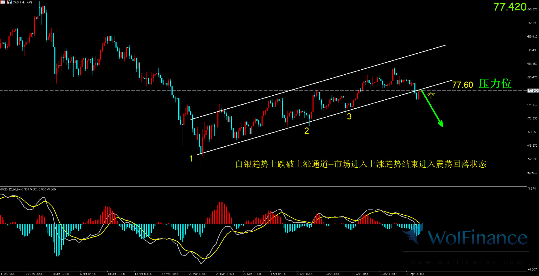 周三(04 月 22 日)白银早盘跌破上涨通道,当前价格报 77.420 附近,核心源于美元指数高位震荡、美联储降息预期降温、工业需求预期波动、前期上涨趋势动能减弱多重因素交织,银价短期承压回落。