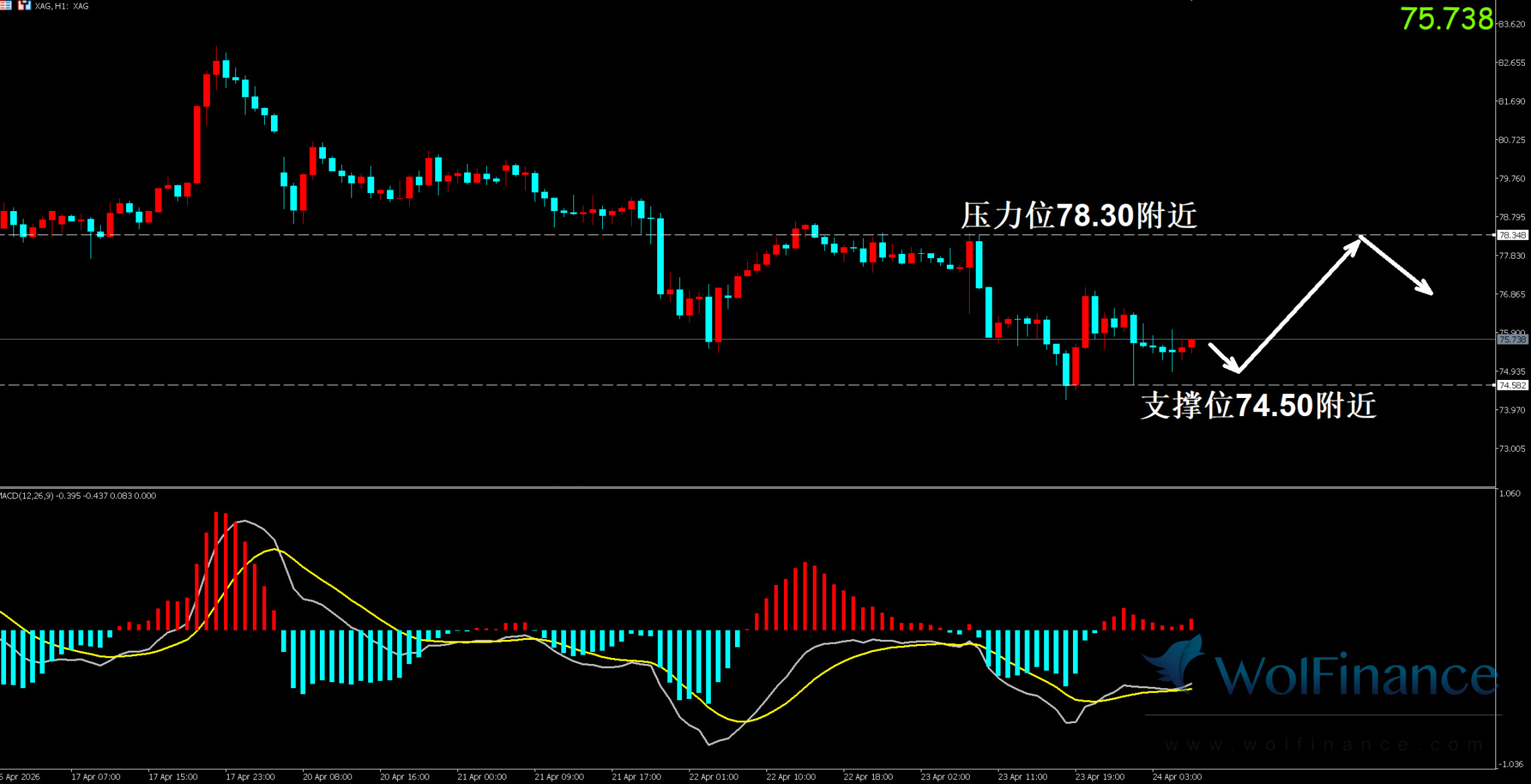 周五(04 月 24 日)白银早盘低位震荡,当前价格报 75.738 附近,核心源于美元指数高位震荡、美联储政策预期博弈、工业需求预期波动、市场避险情绪降温多重因素交织,银价短期处于区间震荡回落阶段。