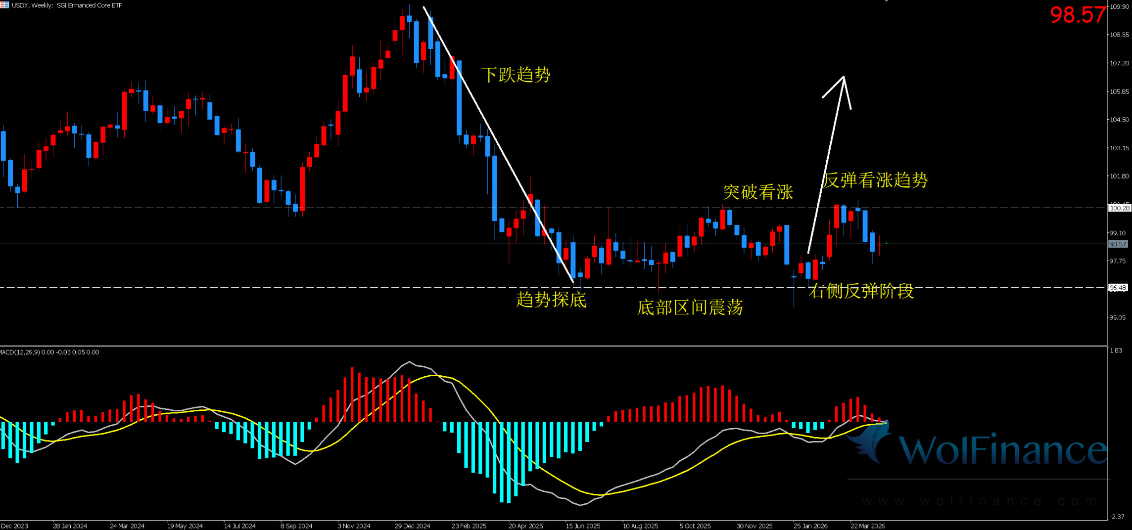 美元指数处于周线级别右侧反弹阶段,当前报价 98.57,底部震荡后的突破看涨趋势明确,美元走强对黄金形成直接计价压制,限制了金价的反弹空间。