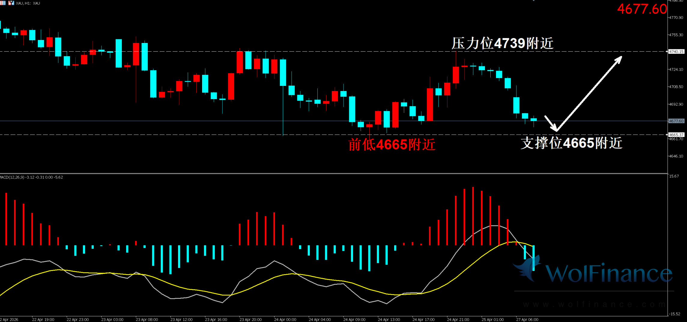 周一(04 月 27 日)黄金早盘低位企稳,当前价格报 4677.60 附近,核心源于美元指数周线级别反弹、美联储降息预期降温、中东地缘情绪反复多重因素交织,金价短期处于低位震荡修复阶段。