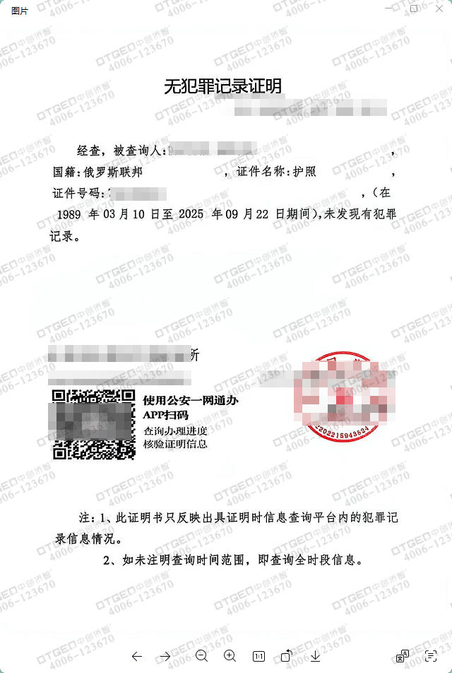 外国人在华无犯罪证明,是由中国公安部门出具的、证明申请人在中国境内居住期间(通常为指定时间段)无犯罪记录的官方文件。根据公安部《公安机关办理犯罪记录查询工作规定》,在中国境内居留180天(含)以上的外国人,都可以申请查询并开具此证明。 以下几种情况,外籍人士通常需要提供这份证明: 1. 申请中国永久居留权(“中国五星卡”) 外国人办理中国永久居留时,“品行良好、无违法犯罪记录”是核心条件之一,无犯罪证明需作为官方佐证材料提交审核。除了开具国籍国的无犯罪证明以外,如果中国相关部门要求申请人证明自己在华期间无违法犯罪记录,外国人在华无犯罪证明也是资格审查的重要内容。 2. 移民第三国 如果外籍人士或正准备加入外籍的中国人,如曾在中国长期居住,在申请移民澳大利亚、加拿大、新西兰等国家时,移民局通常会要求提供在中国期间的无犯罪记录证明。 3. 境外背景调查 例如海外公司在进行员工入职背调时,如果员工曾有在华工作经历,可能会要求提供在华无犯罪记录证明。 中创侨智小编提醒:无犯罪记录仅指法院生效裁判确认有罪的记录,警告、行政拘留等行政违法记录,以及不予处罚等非犯罪情形,均不影响无犯罪证明的出具。 外国人在华无犯罪证明公证书,是由中国公证机构对“外国人在华无犯罪证明”的真实性、合法性进行公证后出具的文书,核心作用是让无犯罪记录证明获得国外机构的认可。 中创侨智小编总结:简单来说,无犯罪记录证明是“原件”,而无犯罪记录公证书是经过公证处“认证”后的法律文件。 很多情况下,不仅要求申请人提供无犯罪记录证明原件,还要求该证明经过公证。这是因为: 1. 增强证明的法律效力:公证机构对证明的真实性、合法性进行审查和确认,使其更具权威性。 海外移民与签证申请:外国人回国定居、申请第三国移民,或办理第三国长期签证时,目标国移民局、使领馆或要求提供经公证的无犯罪证明,作为筛选申请人、排查安全风险的核心材料。 海外就业与劳务输出:外国人结束在华居留,前往其他国家就业(如德国蓝卡申请等),或参与涉外劳务派遣时,东道主国家雇主及劳工部门或强制查验公证书,规避用工风险,杜绝有犯罪前科人员入职。 海外教育与国际组织任职:外国人前往国外深造、申请欧美等国高校,或应聘国际组织岗位时,相关机构或要求提供公证书,评估其道德操守与合规性。 其他涉外民事事务:跨国婚姻登记、海外遗产继承、跨国收养等场景中,相关国家的婚姻登记处、法院、移民局或要求提供公证书,确认当事人身份合法性,保障涉外民事活动的法律效力。 中创侨智小编提醒:公证书需配合无犯罪证明使用,单独出具无法律效力;若公证书用于非海牙公约成员国,还需完成中国外交部认证及目标国驻华使领馆领事认证,否则国外机构不予认可。 这是外籍人士在办理公证时最容易混淆的概念。下面来看一组中创侨智具体公证样例。 【实体公证】 【非实体公证】 区别在哪里? 两者法律效力完全等同(依据《中华人民共和国电子签名法》,可靠电子签名与手写签名、盖章效力无差别),核心区别在于是否有物理载体,适用场景各有侧重,具体差异如下: 实体公证:即传统纸质公证书,由公证处出具,印有公证处公章、公证员签名章(或亲笔签名),部分重要文书会附加钢印,有明确的物理形态,可留存归档、现场查验。 非实体公证:又称电子公证书,原件属实是公证处按法定程序生成的电子文件,多为PDF格式,带有电子签章和防伪标识,可存储于电子设备(手机、电脑),支持在线验证。 外观与载体: 实体公证为纸质载体,辨识度高; 非实体公证为纯数字文件,无物理形态,可在线传输。 办理与领取: 实体公证需线下提交材料,可现场领取或邮寄,适合偏好线下办事的申请人; 非实体公证可通过线上平台申请,审核后即时推送至手机、邮箱,零跑腿。 适用场景: 实体公证适配涉外事务(如海外移民、签证、留学)、需原件存档的场景,通用性强,是外国人办理涉外业务的首选; 非实体公证适合国内线上业务、本地政务办理,国内多城政务系统可直接调取。 验证方式: 实体公证需核对签章及备案信息,部分需现场核实,流程繁琐; 非实体公证输入编号即可在线实时验证,便捷高效。 中创侨智小编提醒:目前不少公证处支持“实体+电子”双模式,办理实体公证时可同步获取电子版,兼顾线下使用与线上便捷性。 如何选择? 选择哪一种公证,取决于使用目的地国家的要求以及接收方的具体规定。 有些国家(如多数大陆法系国家)更认可实体性公证,认为其证明力更强; 而有些国家(尤其是英美法系国家)可能接受非实体性公证,因为他们的公证制度本身就偏向“形式性”或“程序性”公证。 中创侨智小编认为,最稳妥的做法是:在办理前,咨询目的地国家公证书的接收方(如移民律师、境外雇主、使领馆等),或向国内公证机构及专业中介机构了解具体要求。 外国人在华无犯罪证明及公证书,均需在中国境内办理,海外无法直接开具;若外国人已返回海外,可委托代办,具体开具地点及要求如下: 办理主体:在中国境内居留满180天(含)以上的外国人,向居住地县级以上公安出入境管理部门申请。 办理地点:以申请人临时住宿登记地、工作地或居住地为准,选择对应的公安出入境管理部门。 所需材料:一般包括本人有