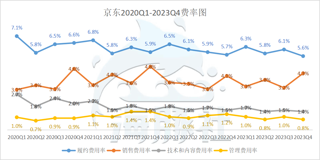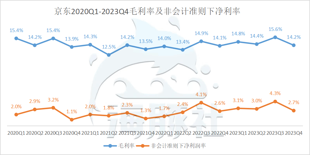具体来看,3C品类的销售增长是主要的原因,同时日用百货重回正向增长没有“拖后腿”。Q4商品收入2465亿元,同比增长3.7%,其中电子产品及家用电器商品收入1504亿元,同比增长6.1%;日用百货商品收入961亿元,同比增长0.2%。服务收入84亿元,同比增长3.0%,其中平台及广告服务收入33亿元,同比下滑4%,物流及其他服务收入51亿元,同比增长8.1%。