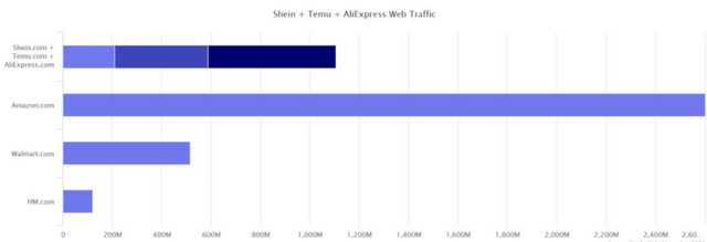 相关数据显示,2023年11月“Temu+SHEIN+阿里速卖通”三者在美国加起来的流量,还不到亚马逊美国站的一半。