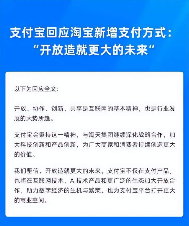 9月4日,淘宝天猫发布公告称,为提升消费者购物体验,淘宝计划新增微信支付能力,并于本意见征集结束后,进行平台规则调整。据悉,本次调整将覆盖全体淘宝和天猫商家。支付宝回应淘宝新增支付方式,“开放造就更大的未来”。