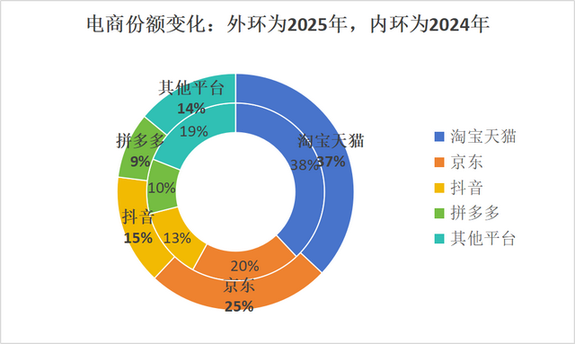 最终从份额上来看,淘宝天猫依然是最大的平台,仅缩水了1%,变动不大。结合今年淘宝一直在刮骨疗伤,扶优去劣,改变整个平台的匹配机制。相当于放弃了一部分既有利益,为一些有潜力的中腰部商家提供流量。匹配效率和转化率势必不如原来,份额下滑相对合理。