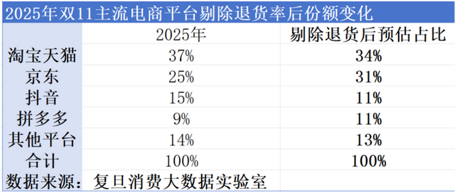 值得注意的是,今年高退货率的问题,巨型防拆吊牌还登上了热搜。商家不想被薅羊毛。整体的销售额也有很大水分,特别是抖音和淘宝天猫,优势品类都在服装,是重灾区。剔除退货之后,京东的份额已经直逼淘宝天猫,抖音变得和拼多多旗鼓相当。