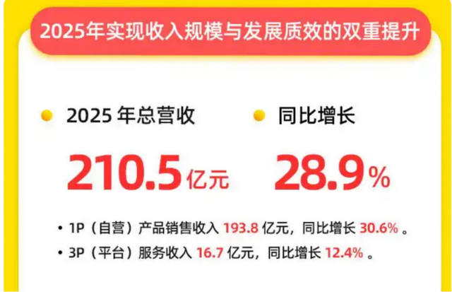 2025全年也提交了一份优异成绩单。总净收入210.5亿元,同比增长28.9%。产品净收入193.8亿元,同比增长30.6%。服务净收入16.7亿元,同比增长12.4%。成交的消费产品数量为4170万件,而2024全年为3530万件。