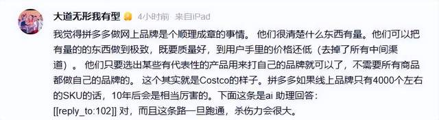 最了解拼多多的投资人段永平在雪球上点评了“新拼姆”。他谈道“这个其实就是Costco的样子。拼多多如果线上品牌只有4000个左右的SKU的话,10年后会是相当厉害的。”这段发言让大家更了解这个项目。拼多多又深化了“Costco+Disney”的创业基因,也再次深扎了国内供应链。