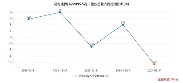 2024年一季度,马可波罗实现营业收入13.13亿元,同比下降16.01%;归属净利润为1.97亿元,同比下降16.03%,幅度进一步加大。