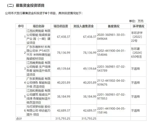 募资投向的6个项目没有改变。主要用于江西加美陶瓷有限公司智能陶瓷家居产业园(一期)建设项目、广东东唯新材料有限公司年产540万平方米特种高性能陶瓷板材项目、江西唯美陶瓷有限公司陶瓷生产线绿色智能制造升级改造项目、广东家美陶瓷有限公司绿色智能制造升级改造项目、江西和美陶瓷有限公司建筑陶瓷生产线绿色智能制造升级改造项目、马可波罗控股股份有限公司综合能力提升项目。