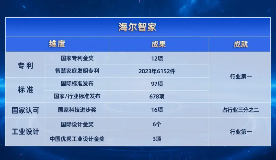 标准数量方面,海尔智家国家/行业标准发布678项,国际标准发布97项,均为行业最多;专利数量方面,海尔智家荣获国家专利金奖12项,行业第一;2023年海尔智慧家庭发明专利6152件,位居行业第一;工业设计方面,海尔智家拥有6个国际设计金奖,3项中国优秀工业设计金奖,行业最多;国家认可方面,海尔智家共获得16项国家科技进步奖,占行业三分之二。
