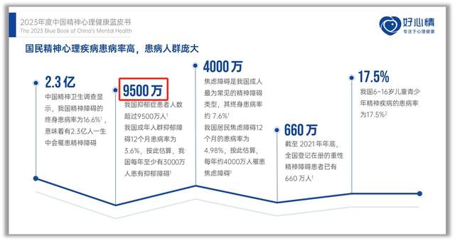 根据《2023年度中国精神心理健康蓝皮书》数据显示,目前我国抑郁症患者大约有9500万人(见下图2),其中18岁至24岁占比35.32%;18岁以下占比达到30.28%,超过了2800万人。显然可见,我国抑郁症患病正在逐年上升并且呈现年轻化趋势。