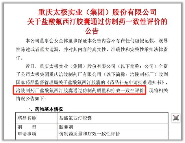 作为一家老牌国企,太极集团在抗抑郁症治疗方面也展现出强劲的发展势头和市场竞争力。2020年4月,太极集团发布公告称控股子公司西南药业股份有限公司旗下的氢溴酸西酞普兰片已经通过仿制药一致性评价,成为继2018年科伦药业后国内第二家该药品过评企业。此外,2023年12月,太极集团称子公司重庆涪陵制药厂有限公司旗下的盐酸氟西汀胶囊通过仿制药质量和疗效一致性评价,见下图4。