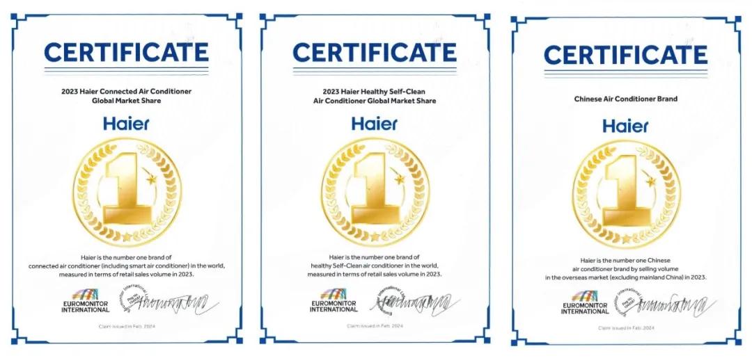 全球市场认可:据欧睿国际数据显示,海尔空调第 8 年位居互联空调(包括智能空调)全球销量第一;第 6 年居健康自清洁空调全球销量第一;第 4 年位居海外市场中国家用空调自主品牌销量第一。