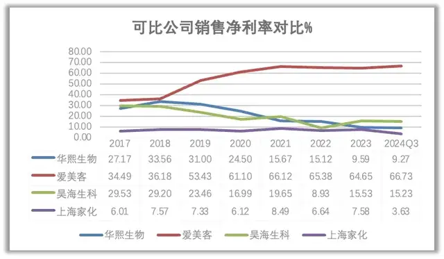 成本看上去处于“失控”状态,让华熙生物2023年销售净利率为近十年新低,只有9.27%,与可比公司爱美客和昊海生科相比都低很多,仅强于最弱的上海家化。